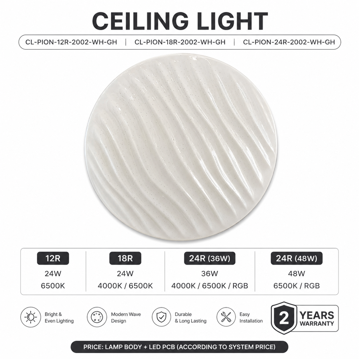 Upgrade your space with the Lightinghub Series 2002 Ceiling Light, designed to deliver modern aesthetics, efficient lighting, and reliable performance. With its elegant wave-texture design, this ceiling light enhances any interior while providing bright and even illumination.