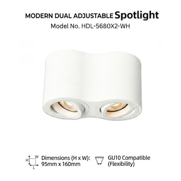 The HDL-5680X2 Series is a modern dual-head surface-mounted downlight designed to provide enhanced illumination with a clean and architectural look. Featuring a smooth, wave-edged rectangular housing, this fixture integrates two adjustable spotlight modules, allowing precise directional lighting for both functional and accent purposes.